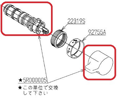 | TMJ40CX等に使用する吐水切替用のユニットです。ハンドルと開閉部分の部品のセットです。 | |