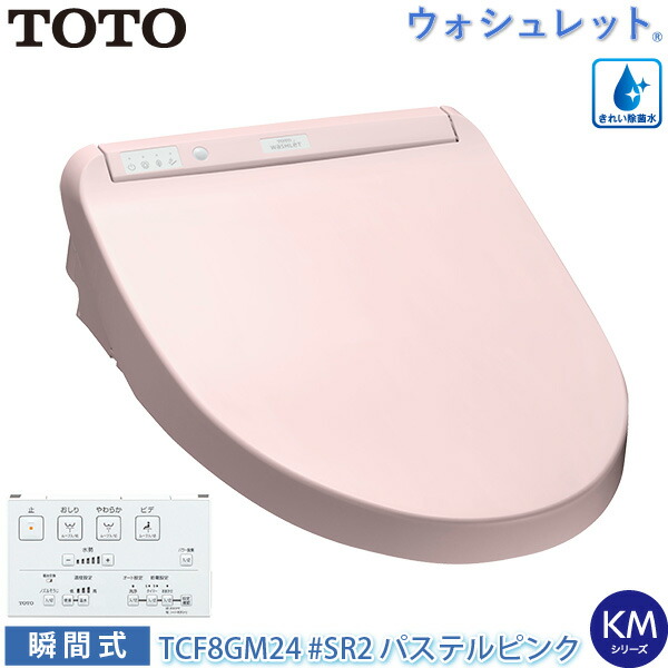 | TOTO 温水洗浄便座 ウォシュレット TCF8GM54 (#SR2) パステルピンク KMシリーズ 瞬間式 (きれい除菌水/ノズルきれい/プレミスト/オート開閉) 暖房便座 自動開閉 リモコン付き 継ぎ目なし 掃除 簡単 節電 節水 トートーおすすめのポイント・環境にやさしい「きれい除菌水」〔除菌成分(次亜塩素酸)を含む水〕でノズルを除菌!・使用後にノズルの内側も外側も自動で洗浄・除菌!ノズルのきれいが長持ち・自動で便器にミストを吹き付け、汚れを付きにくく、落ちやすくする技術「プレミスト」搭載!・サイドにそでがないので床面掃除がしやすく、空間もスッキリ!・便座のつぎ目をなくし、掃除のしやすさを追求!・本体ワンタッチ着脱&便ふた着脱でふきにくかったところもラクラク拭ける・防汚効果の高いクリーン樹脂だから、汚れをはじき、サッとひとふきでお手入れできる・便器に近づくと手を触れずに便ふたが自動開閉するので清潔!・オートパワー脱臭で使用後のニオイを強力に脱臭!次の人に不快感を与えない・座るまでスイッチ操作ができない着座センサー機能により誤操作の心配なし・洗浄中のムダな捨て水がないので節水できる・瞬間暖房便座で使う時だけあたためるので、保温電力を抑え年間の電気代を大幅節約!・便座と便ふたのダブル保温で熱を逃がさすいつでもあたたか、省エネで快適!・タイマー節電、スーパーおまかせ節電など、エコ機能が充実・少ない洗浄水でもしっかりとした洗い心地のたっぷリッチ洗浄(おしり洗浄のみ)で快適!※商品説明には本体カラーホワイトのイメージを使用しておりますが、こちらの商品は「パステルピンク」となります。きれい除菌水でノズルを除菌!ボタンひとつで手動もOK!使用後にノズルの内側も外側も自動で洗浄・除菌!きれい除菌水のチカラできれいが長持ち。「きれい除菌水」とは、水に含まれる塩化物イオンを電気分解して作られる除菌成分(次亜塩素酸)を含む水です。薬品や洗剤を使わず、水から作られ、時間がたつともとの水に戻るので環境にやさしいのが特長です。※詳しくはウォシュレットカタログ(リテール向け)をご参照ください。汚れを付きにくく、落ちやすくする技術「プレミスト」搭載!便座に座ると自動で便器にミストをふきつけ水のクッションをつくるので汚れが付きにくい!トイレ掃除がしやすい充実の清掃機能とデザイン。つぎ目のない便座や、便ふた着脱で便ふたがラクに取り外せるのでお掃除がしやすい。カンタンに取り外せて、隅々までお掃除しやすい!便座とタンクの間はもちろん、そでなしデザインだから床面の掃除もラクラク!防汚効果の高いクリーン樹脂が汚れをはじく!セルフクリーニング機能など、ノズルの清潔にもとことんこだわった機能が満載です。便ふたのオート開閉機能で閉め忘れなしで節電にも♪便器に近づくと手を触れずに便ふたが自動開閉するので清潔です。オートパワー脱臭で使用後のニオイを強力に脱臭!約2倍のパワー脱臭に切り替わり強力にニオイを脱臭。次の人に不快感を与えません。誤操作の心配がない着座センサー座るまでスイッチ操作を受け付けないから、誤操作の心配がありません。従来品よりさらに節水・節電!普段どおりに使ってエコ。洗浄中の捨て水がないので、ムダな水を使うことがなく節水できる。瞬間暖房便座で保温電力を抑えて電気代を大幅節約!人感センサーにより、使用するときだけ便座をあたためるので節電になります。※室温が約26℃以下の場合、便座を約26℃で保温しています。便座と便ふたのダブルの断熱構造で熱を逃がさない!省エネ効果がさらにアップ!約30%も節電できる。熱を逃がさずいつでもあたたか。いつもどおりに使っていても経済的な節電機能。設定した時刻やまったく使用しない時間帯に便座ヒーターが自動で切れるから節電できる!少ない洗浄水でもしっかりとした洗い心地。いつでも快適に使える、豊富な洗浄機能を搭載!ウォシュレットの「瞬間式」とは節電なのに湯切れなし。朝のトイレラッシュ時も安心。洗浄する時にお湯を沸かす方式で、連続使用でもお湯が冷たくなりません。使用する時だけお湯をつくるので節電にも効果的です。機能一覧アイコンKMシリーズはトイレのきれいを守る清潔機能を多く搭載!さらにトイレが快適。製品サイズ便器のサイズをご確認下さい。トイレ内の寸法をご確認下さい。トイレ内の電源や取り付けタイプ等をご確認下さい。取付方法について重要なご注意点商品サイズ・仕様商品名TOTO ウォシュレット KMシリーズカラーパステルピンク品番TCF8GM54 #SR2JANコード4940577937186商品寸法約 幅384×奥行531×高さ131mm商品質量約 5.1kg定格電源AC100V 50/60Hz定格消費電力1270W電源コード約 1.0m(漏電保護プラグ、アース線付)リモコンサイズ:約 幅200×奥行20×高さ120mm電源:単3形アルカリ乾電池2個給水圧力最低必要水圧:0.05MPa(流動時)最高水圧:0.75MPa(静止時)給水温度/周囲使用温度給水温度:0〜35℃/周囲使用温度:0〜40℃洗浄装置吐水量※1おしり洗浄:約 0.27
