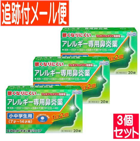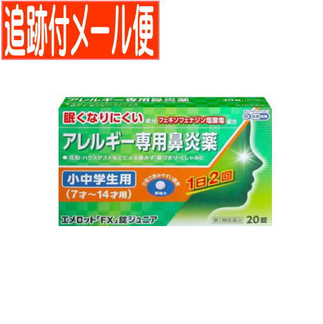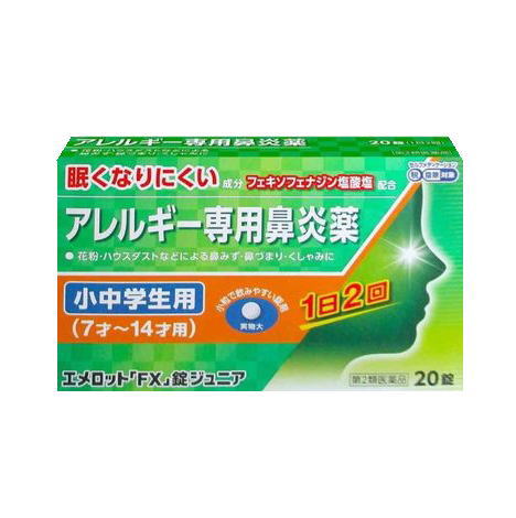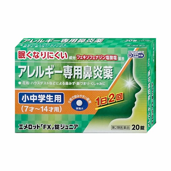 | ※パッケージデザイン等は予告なく変更されることがあります。予め御了承下さい。商品特徴 ●エメロット「FX」錠ジュニアは,こども(7才〜14才)用のアレルギー専用鼻炎薬です。 ●花粉やハウスダストなどによる鼻みず,鼻づまり,くしゃみなどのつらいアレルギー症状に優れた効果を発揮します。 ●1日2回(朝・夕)の服用で,24時間効果が持続します。●眠くなりにくい鼻炎内服薬です。 ●こども(7才〜14才)でも飲みやすい小さな丸型錠剤です。●空腹時にも服用できます。効能・効果 花粉,ハウスダスト(室内塵)などによる次のような鼻のアレルギー症状の緩和:くしゃみ,鼻みず,鼻づまり使用上の注意 本剤は小児用ですが,鼻炎用内服薬として定められた一般的な注意事項を記載しています。■してはいけないこと (守らないと現在の症状が悪化したり,副作用・事故が起こりやすくなります)1.次の人は服用しないでください (1)本剤又は本剤の成分によりアレルギー症状を起こしたことがある人。 (2)7才未満の小児。 2.本剤を服用している間は,次のいずれの医薬品も使用しないでください 他のアレルギー用薬(皮膚疾患用薬,鼻炎用内服薬を含む),抗ヒスタミン剤を含有する内服薬等(かぜ薬,鎮咳去痰薬,乗物酔い薬,催眠鎮静薬等),制酸剤(水酸化アルミニウム・水酸化マグネシウム含有製剤),エリスロマイシン 3.服用前後は飲酒しないでください4.授乳中の人は本剤を服用しないか,本剤を服用する場合は授乳を避けてください (動物試験で乳汁中への移行が認められています)■相談すること1.次の人は服用前に医師,薬剤師又は登録販売者に相談してください (1)医師の治療を受けている人。 (2)アレルギー性鼻炎か,かぜ等他の原因によるものかわからない人。 (3)気管支ぜんそく,アトピー性皮膚炎等の他のアレルギー疾患の診断を受けたことがある人。 (4)鼻づまりの症状が強い人。 (5)妊婦又は妊娠していると思われる人。 (6)高齢者。 (7)薬などによりアレルギー症状を起こしたことがある人。 2.服用後,次の症状があらわれた場合は副作用の可能性がありますので,直ちに服用を中止し,この説明書を持って医師,薬剤師又は登録販売者に相談してください [関係部位:症状]皮膚:のど・まぶた・口唇等のはれ,発疹,かゆみ,じんましん,皮膚が赤くなる消化器:吐き気,嘔吐,腹痛,消化不良 精神神経系:しびれ感,頭痛,疲労,倦怠感,めまい,不眠,神経過敏,悪夢,睡眠障害泌尿器:頻尿,排尿困難 その他:動悸,味覚異常,浮腫,胸痛,呼吸困難,血圧上昇,月経異常 まれに次の重篤な症状が起こることがあります。その場合は直ちに医師の診療を受けてください。[症状の名称:症状] ショック(アナフィラキシー):服用後すぐに,皮膚のかゆみ,じんましん,声のかすれ,くしゃみ,のどのかゆみ,息苦しさ,動悸,意識の混濁等があらわれる。 肝機能障害:発熱,かゆみ,発疹,黄疸(皮膚や白目が黄色くなる),褐色尿,全身のだるさ,食欲不振等があらわれる。 無顆粒球症:突然の高熱,さむけ,のどの痛み等があらわれる。白血球減少:突然の高熱,さむけ,のどの痛み等があらわれる。 好中球減少:突然の高熱,さむけ,のどの痛み等があらわれる。 3.服用後,次の症状があらわれることがありますので,このような症状の持続又は増強が見られた場合には,服用を中止し,この説明書を持って医師,薬剤師又は登録販売者に相談してください 口のかわき,便秘,下痢,眠気用法・用量次の量を服用してください。[年令:1回量:1日服用回数] 12才〜14才の小児:2錠:2回(朝・夕)7才〜11才の小児:1錠:2回(朝・夕)7才未満の小児:服用しないでください用法に関する注意 (1)定められた用法・用量を厳守してください。(2)小児に服用させる場合には,保護者の指導監督のもとに服用させてください。 (3)花粉などの季節性のアレルギー性鼻炎症状に使用する場合は,花粉飛散予測日から,又は,症状が出始めたら早めに服用を始めると効果的です。 (4)3〜4日間服用しても症状の改善がみられない場合は服用を中止し,医師,薬剤師又は登録販売者に相談してください。また,症状の改善がみられても2週間を超えて服用する場合は,医師,薬剤師又は登録販売者に相談してください。 (5)錠剤の取り出し方 錠剤の入っているPTPシートの凸部を指先で強く押して裏面のアルミ箔を破り,取り出して服用してください。(誤ってそのまま飲み込んだりすると食道粘膜に突き刺さる等思わぬ事故につながります) 成分・分量(1日量:2錠中)フェキソフェナジン塩酸塩 60mg(1日量:4錠中)フェキソフェナジン塩酸塩 120mg 添加物:部分アルファー化デンプン、セルロース、ヒドロキシプロピルセルロース、クロスカルメ ロースNa、無水ケイ酸、ステアリン酸Mg、ヒプロメロース、マクロゴール、酸化チタン、カルナウバロウ医薬品の保管及び取り扱い上の注意 (1)直射日光の当たらない湿気の少ない涼しい所に保管してください。(2)小児の手の届かない所に保管してください。 (3)他の容器に入れ替えないでください。 (誤用の原因になったり品質が変わるのを防ぐため) (4)使用期限(