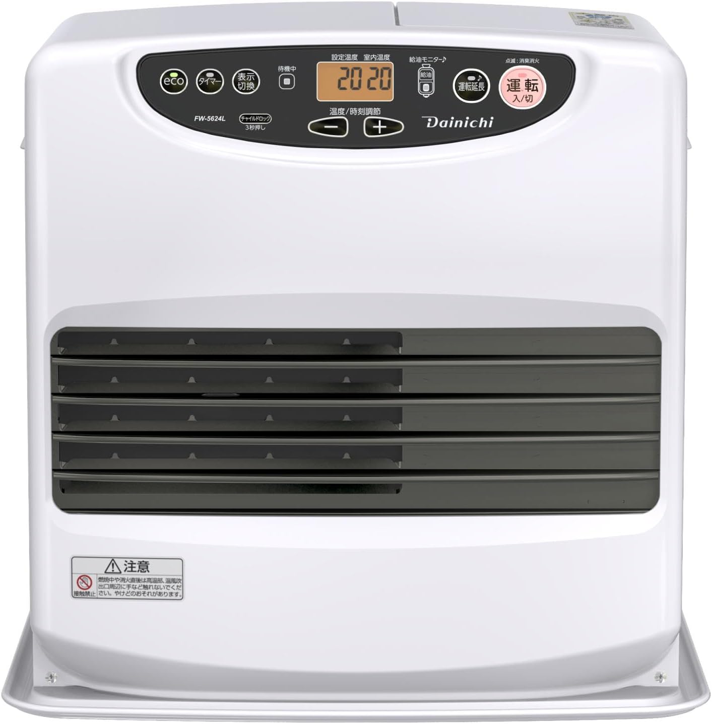 | ■スピード着火(35秒※保温なしの着火時間) ■パワフル秒速消臭システム ■ecoおまかせモード(一時消化機能あり) ■オレンジ液晶※文字盤は光りません。 ■タンクWとって ■ワンタッチ汚れんキャップ ■給油モニター(給油サイン) ■ノンスパーク点火 ■タイマー ■メロディーお知らせ ◇暖房のめやす ・木造(戸建):10畳まで(16.5m2) ・コンクリート(集合):13畳まで(21.5m2) ◇タンク容量(L):9.0 ◇暖房出力(kW)最大〜最小:3.60〜0.74 ◇燃料消費量(L/h)最大〜最小:0.350〜0.072 ◇燃焼継続時間(h)大火力〜小火力:25.7〜125.0 ◇消費電力(W)(50/60Hz) ・大火力時:128/128 ・小火力時:62/62 ・最大(点火時):370/370 ・待機時:1.0/1.0 ◇運転音(dB)最大〜最小:37〜25 ◇本体外形寸法(置台含む)高さ×幅×奥行(mm):445×430×357 ◇質量(kg):11.1 FW3625LW こちらのページは、モデルチェンジに伴い、 現在「FW-3625L-W」を販売しております。 FW-3622L-W 2022年度モデル FW-3623L-W 2023年度モデル FW-3624L-W 2024年度モデル FW-3625L-W 2025年度モデル 販売中 ※主な仕様に変更はございません。 | |