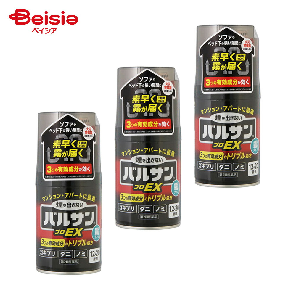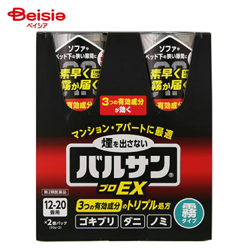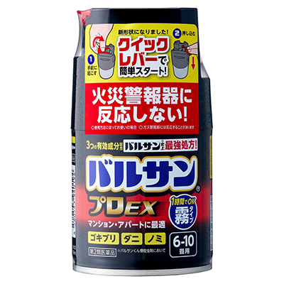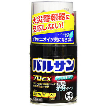 | 【注意!】こちらの商品は医薬品です。※医薬品は使用上の注意をよく読み用法・用量を守って正しくお使い下さい。・万一、誤って飲んだ場合や、吸入などにより身体に異常が起きた場合は、速やかに受診して下さい。・その際、製品名・成分名を医師に告げるか、本品を持って行って下さい。・使用前に、よく添付文書をお読みになってからご使用下さい。・その際、ご不明な点がございましたら、薬剤師・登録販売者にご相談下さい。商品説明(製品の特徴)・ボタンを押すだけの簡単始動・ミクロの霧でズミズミまでよく効く。・3つの有効成分配合使用上の注意[してはいけないこと](1)病人、妊婦、小児は薬剤(霧)に触れないようにしてください。(2)人体に向けて噴射しないでください。霧を直接吸入しないでください。万一吸い込んだ場合、咳き込み、のど痛、頭痛、気分不快等を生じることがあります。(3)退出後、必ず1時間以上経過してから入室してください。換気のために入室する際、刺激に敏感な方は薬剤を吸い込むと咳き込み、呼吸が苦しくなることがあります。必ず、タオルなどで口や鼻を押さえて薬剤を吸い込まないようにしてください。 (4)霧が出始めたら部屋の外に出て、所定時間(1時間)以上経過しないうちに入室しないでください。煙が流入する可能性があるので、密閉性の低い隣室にはいないようにしてください。(5)使用後は充分に換気をしてから中に入ってください。(6)本品の噴射時にくん煙剤に同じ部屋で使用しないでください。引火、爆発の恐れがあります。(7)マッチやライターなどで火をつけないでください。[相談すること](1)霧を吸って万一身体に異常を感じたときは、できるだけこの説明文書を持って直ちに本品がオキサジアゾール系殺虫剤とピレスロイド系殺虫剤の混合剤であることを医師に告げて、診療を受けてください。(2)今までに薬や化粧品等によるアレルギー症状(発疹・発赤、かゆみ、かぶれなど)を起こしたことのある人は、使用前に医師又は薬剤師に相談してください。[その他の注意](1)定められた使用方法、使用量を厳守してください。(2)本品は可燃性ガスを使用しているので、火気には充分注意し、ガス湯沸器や内釜式浴槽の種火、ヒーター等は必ず消し、ガスの元栓は閉めてください。(3)集合住宅等の集中管理方式のガス警報器の場合は住宅管理者に連絡して使用してください。また、ガス警報器は噴射ガスに反応することがあります。警報器に覆いなどをした場合には、絶対にとり忘れないようにして、必ず元に戻してください。(4)食品、食器、おもちゃ、飼料、寝具、衣類、貴金属、仏壇仏具、美術品、楽器、はく製、毛皮、光学機器などに 直接煙が触れないようにしてください。また、ペット、観賞魚、植物は部屋の外に出してください。(5)精密機器(テレビ、パソコン、オーディオ製品、ゲーム機など)にはカバーをかけ、ブルーレイディスク、DVD、CD、MD、フロッピーディスク、磁気テープなどは直接煙に触れるとまれに障害を起こすことがあるので、専用ケースに収納してください。大型コンピューターのある所では使用しないでください。(6)プラスチック製品や家具等は直接霧にかかるとシミや変色の原因となることがあるので、本品から1.5m以上離すか、ビニールシート、新聞紙等で全体を覆ってください。(7)本品は床面中央に置き、必ず立てた状態で使用してください。(8)ボタンを押すと同時に上方へ薬剤が噴射するので、顔を近づけないように注意してください。(9)皮膚に対して弱い刺激性があるので、薬剤が皮膚についた場合は石けんと水で十分に洗ってください。また、目に入った場合は直ちに水でよく洗ってください。(10)食品等に直接薬剤がかかった場合は水で洗ってから使用してください。(11)自動車内では使用しないでください。用法/用量[使用前に準備すること](1)部屋(窓や換気口など)を閉め切り、害虫の隠れ場所となる戸棚、引き出し、押入れなどを開放する。なお、食品、食器、おもちゃ、寝具、衣類、仏壇仏具などは直接煙が触れないように、ビニールシートや新聞紙でカバーをするか、部屋の外に出す。※ガス湯沸器や内釜式浴槽の種火やヒーター等は必ず消し、ガスの元栓は閉めてください。(2)煙が触れないようにテレビ、パソコン、オーディオ製品などの精密機器やピアノなどの楽器にはカバーをする。ディスクやテープ類は付属のケースに入れる。(3)ペット類や観賞魚、植物などは部屋の外に出す。(4)ガス警報器、ガスと火災の両方を感知する複合型警報器には反応することがあるので、袋などで覆う。火災警報器、ガス警報器の取扱いについては、付属の説明書をよく読みご使用ください。[バルサンプロEX ノンスモーク霧タイプを始める](1)部屋の床面のほぼ中央に本品を置き、火災警報器に直接かからない方向に噴射口を向ける。(2)ボタンを指でカチッと音がして固定される位置まで押し込む。●顔を近づけないように注意してくださ