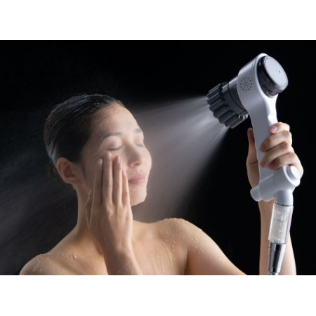 | 〇シャワーじゃないシャワー 2022年6月に誕生する「ミラブルzero」 それは未来を予見させる、新しい生活スタイルへの存在。 52年前に「10歳の少年」が思い描いた世界であり、夢を叶えた瞬間、そして新たな夢の始まりの瞬間でもあった。 まるでタイムスリップしたかのように、それは52年前から続く物語・・・。それが「シャワーじゃないシャワー」ミラブルzero ミラブルzeroは過去からの「進化」ではなく、新しい扉を開く「新化」であり、飛躍する世界をつくる序章に過ぎない。 人々は、それまでの常識をさらなる新しい進化としてイノベーションを起こしてきた。 かつて馬車が自動車に変わり、携帯電話が情報端末としてのスマートフォンに。 それはツールとしての発展だけではない。 私たちは体を水で流し、すすぐためのシャワーを、体をよりよく洗うためのものに新しく進化させる。 シャワーを人々の想いに合わせて取り換えるという日常を生み出しさらに昇華させる。 洗う、その先は洗われるという常識へ。〇「トルネードミスト」に加えて新発想の2つの水流を搭載リングストレート 中心部が空洞になった直進性の高い3つの吐水。空洞部で気流を巻き込むことによってウルトラファインバブルを生成します。ウルトラファインバブルを含み、空洞によってあたりは柔らかでも確かな洗浄力を発揮します。 口に向けて使用する場合は、心地の良い水圧になるようにご調整下さい。スプラッシュストレート 2本の水流を吐出後に衝突させることでねじれた水流が発生します。ねじれ流はウルトラファインバブルを発生させながら、見た目は通常のシャワー水流に見えても、ねじれの効果で毛穴に衝突する際に確かな洗浄力を発揮します。トルネードミスト 1つの吐出口あたり、1秒間に約2,000回転(1分間に約12万回)の高速うず流でウルトラファインバブルを生成。さらに水流が吐出する際、外気を巻き込む機構により、安定した気泡を発生させます。(特許-6717991) 16穴の吐水穴で従来型に比べ、広がりを持たせた水流は安定した水温(湯温)での吐水を実現させています。【仕様】■型番:FBSMZ-TSC-CSC■商品名:ULTRA FINE MIST Mirablezero (ウルトラファインミスト ミラブルゼロ)■製品内容物:本体、トルネードスティック、シャワーホースアダプターセット、G1/2ネジチェッカー、ストレーナー、Oリング、シャワーパッキン、取扱説明書、オーナーズカード■ミラブルzero(本体)・全長:約220mm 70φ・全幅:約110mm(突起部含む)・ヘッド幅:吐水面:約φ55mm、操作部外形:約φ70mm・ヘッド角度:ハンドル垂直に対して50°・重量:約350g・接続:G1/2・材質本体:ポリカーボネート及びABS及びPOMネジ及びバネ:ステンレスパッキン:EPDM■トルネードスティック(塩素低減用カートリッジ)・全長:約72mm・全幅:29φ・接続:G1/2・材質:本体:ポリカーボネート及びPP / パッキン:EPDM・ろ材:亜硫酸カルシウム・品質保持期限(通水前):製造日より2年(※保管状況により異なります)・交換目安:約1〜3ヶ月(※使用頻度、水質、使用条件により異なります)■商品の特長・仕様に関する詳細はメーカーホームページでもご覧頂けます。 | |