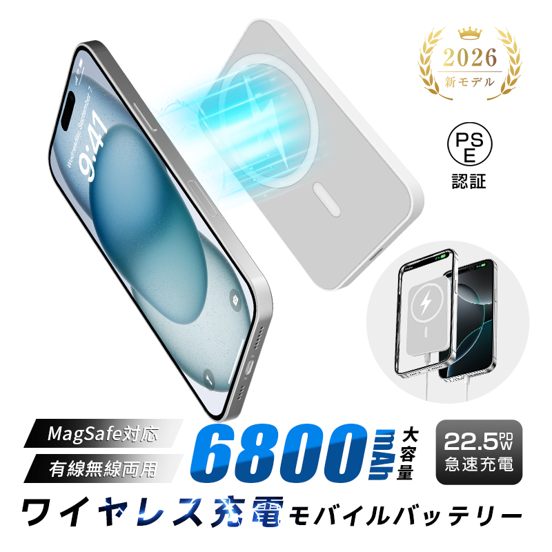 - 【 ★ 強力磁石でピタッと吸着|絡まずスッキリ充電 ★ 】iPhone 12-17シリーズに近づけるだけで、自動的に吸着します。マグネット対応ケースを使えば、ワイヤレス充電対応のAndroidスマホでもマグネット吸着が可能なマグネット式ワイヤレス充電対応のモバイルバッテリーです。